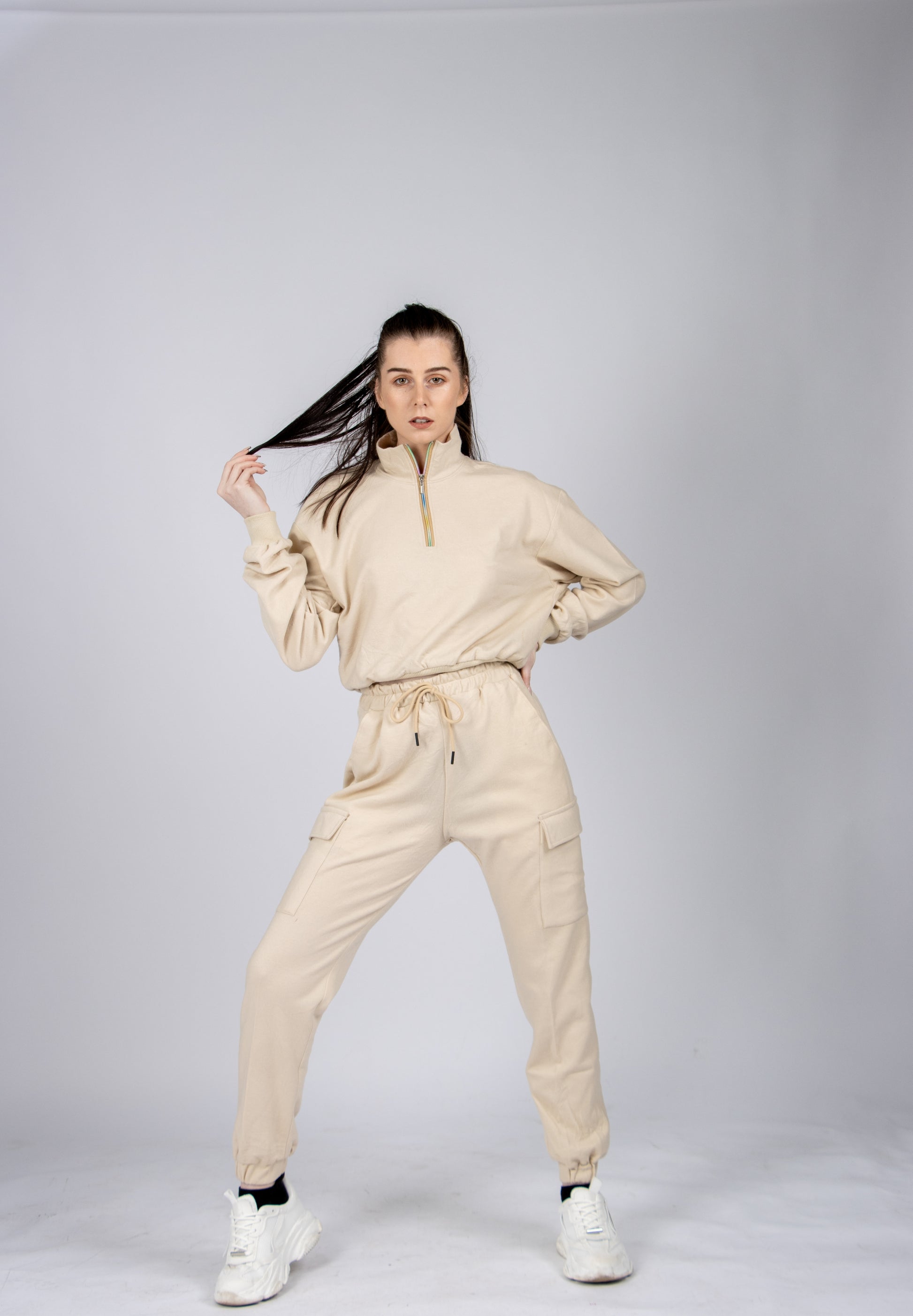 Description: Beige jogger set with cargo pants