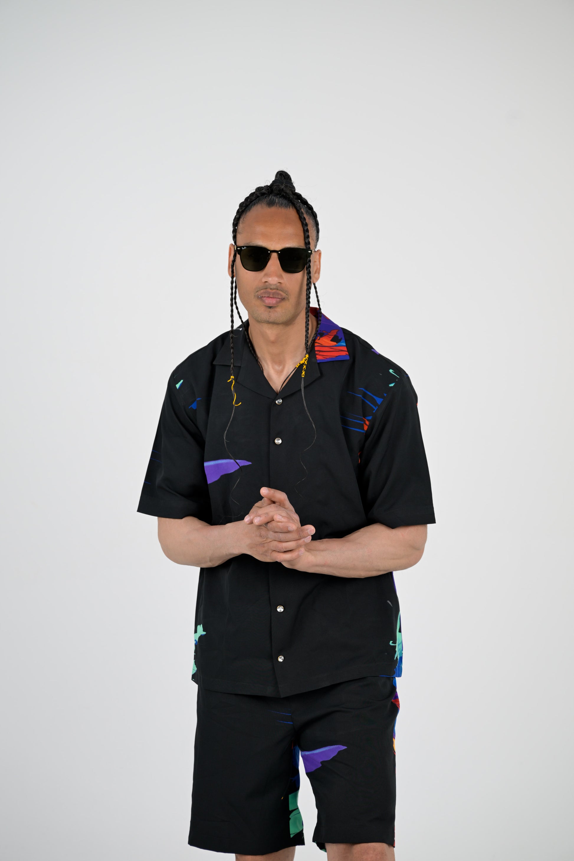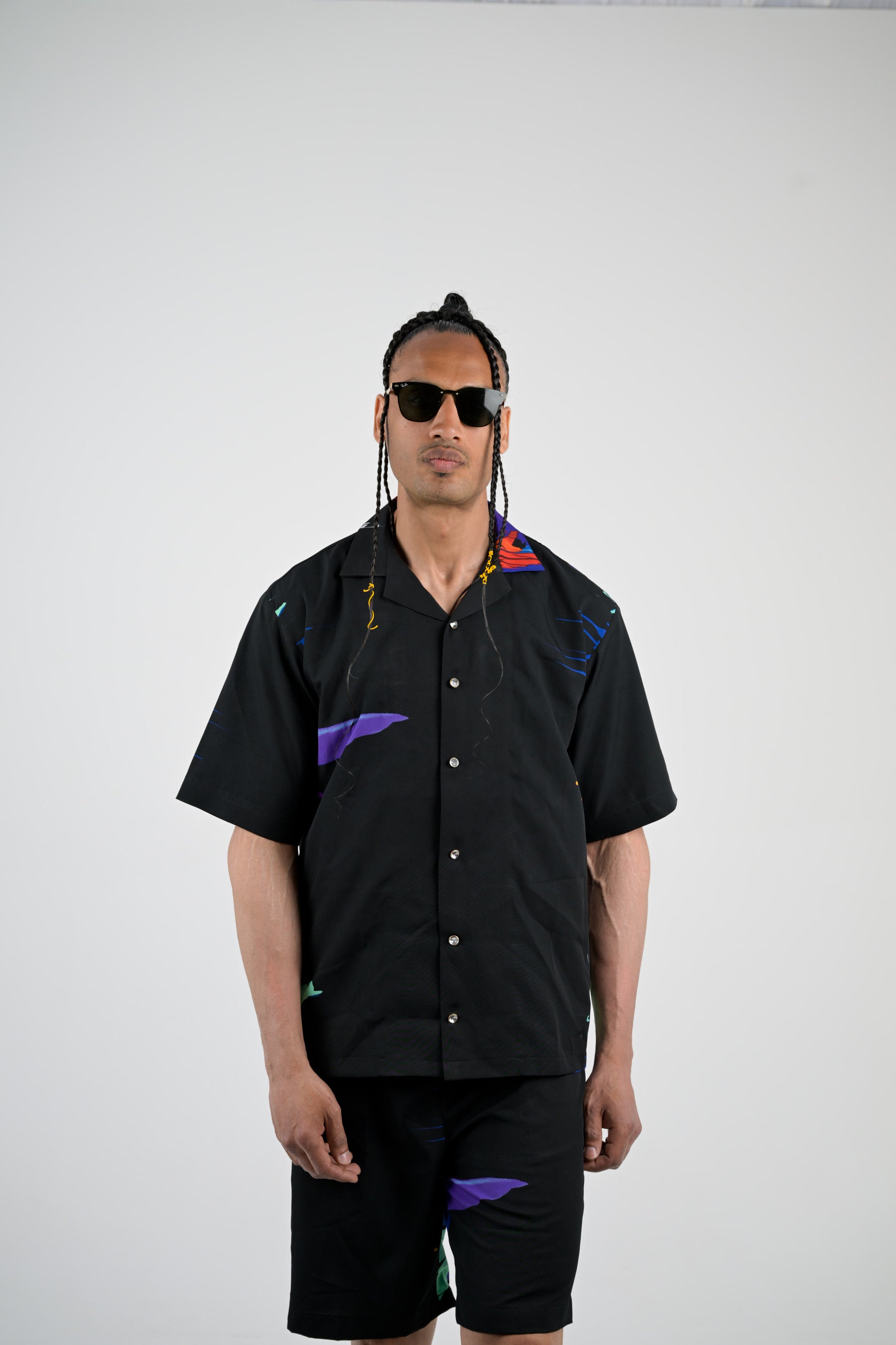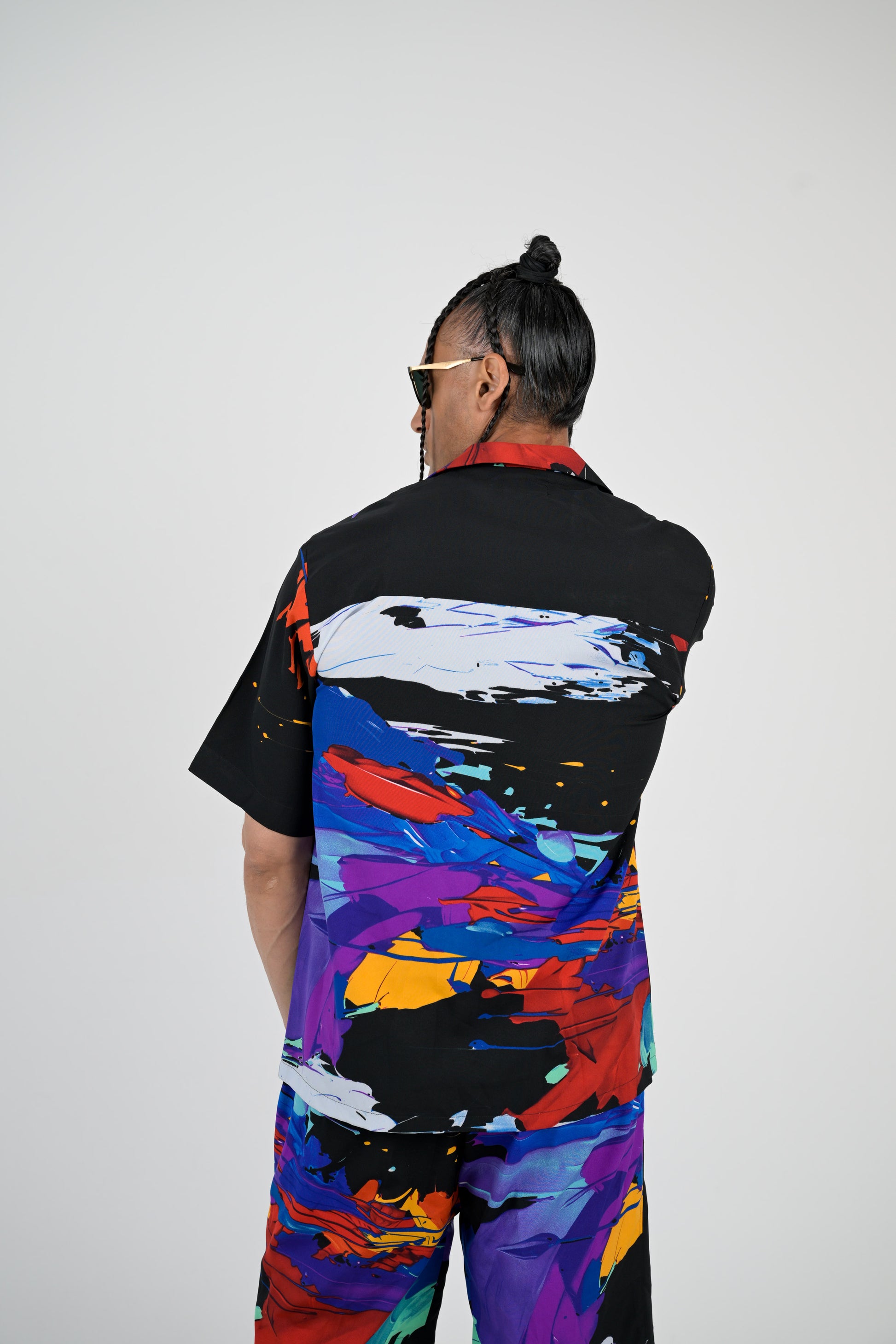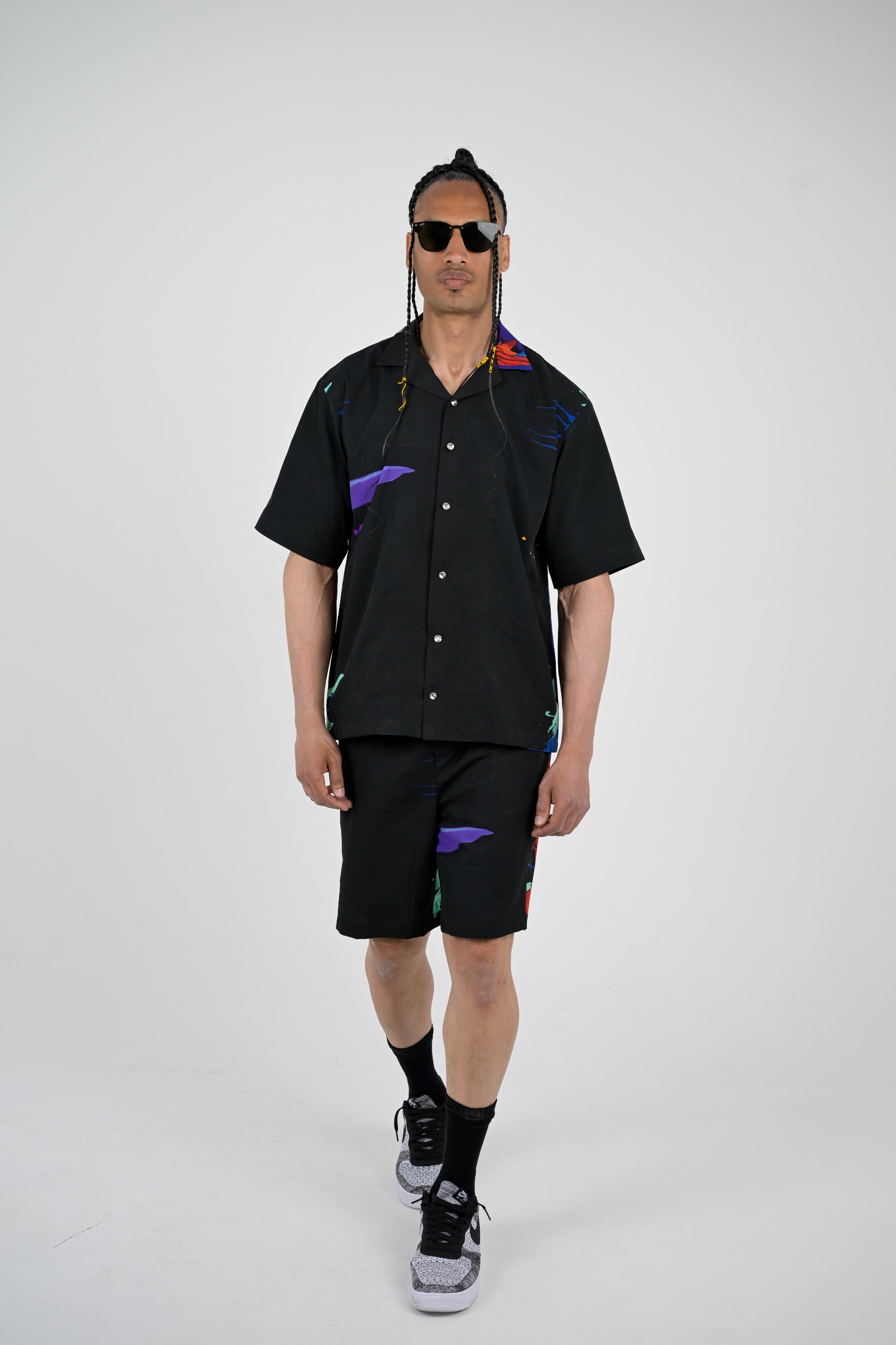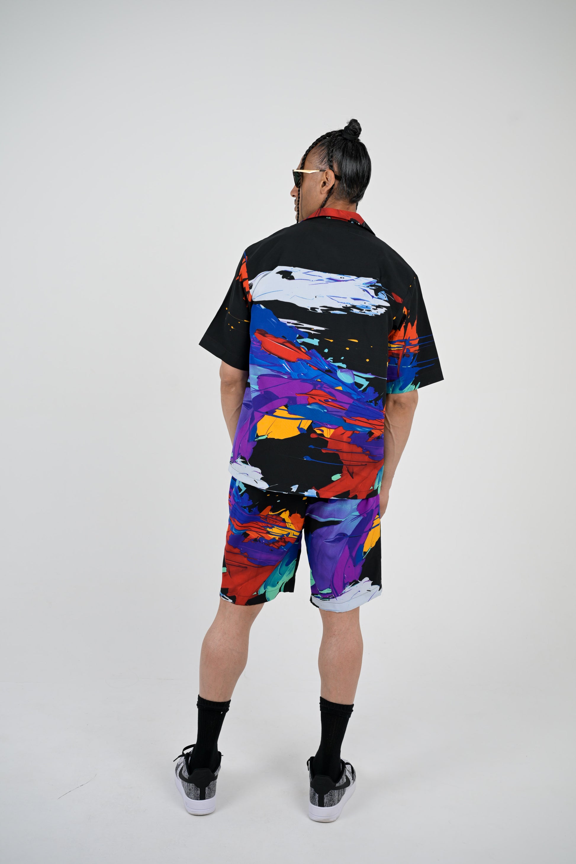 Description: Short sleeve button up shirt and matching shorts made from bold, vibrant fabric. Design characterised by an abstract, colourful pattern.