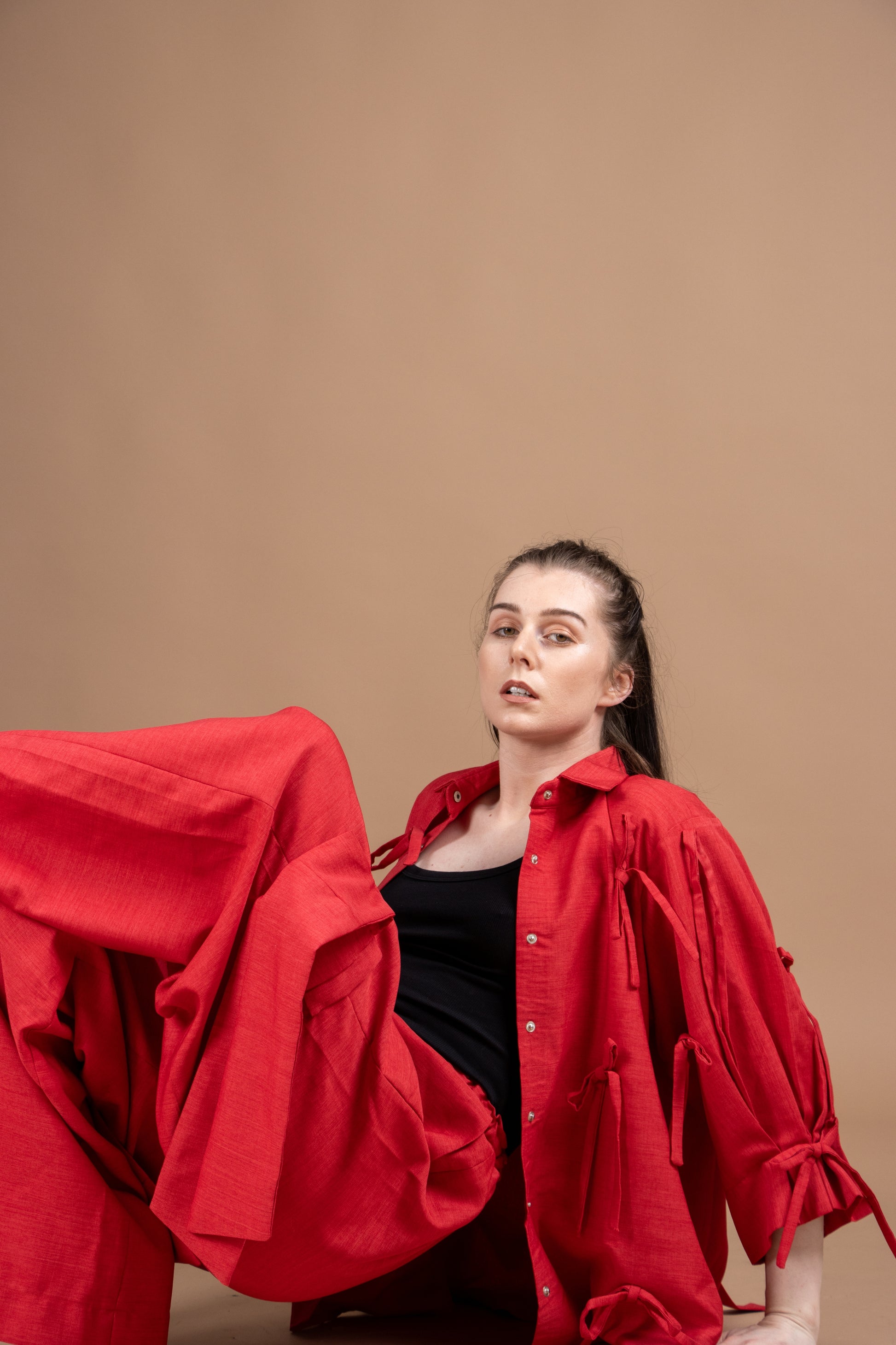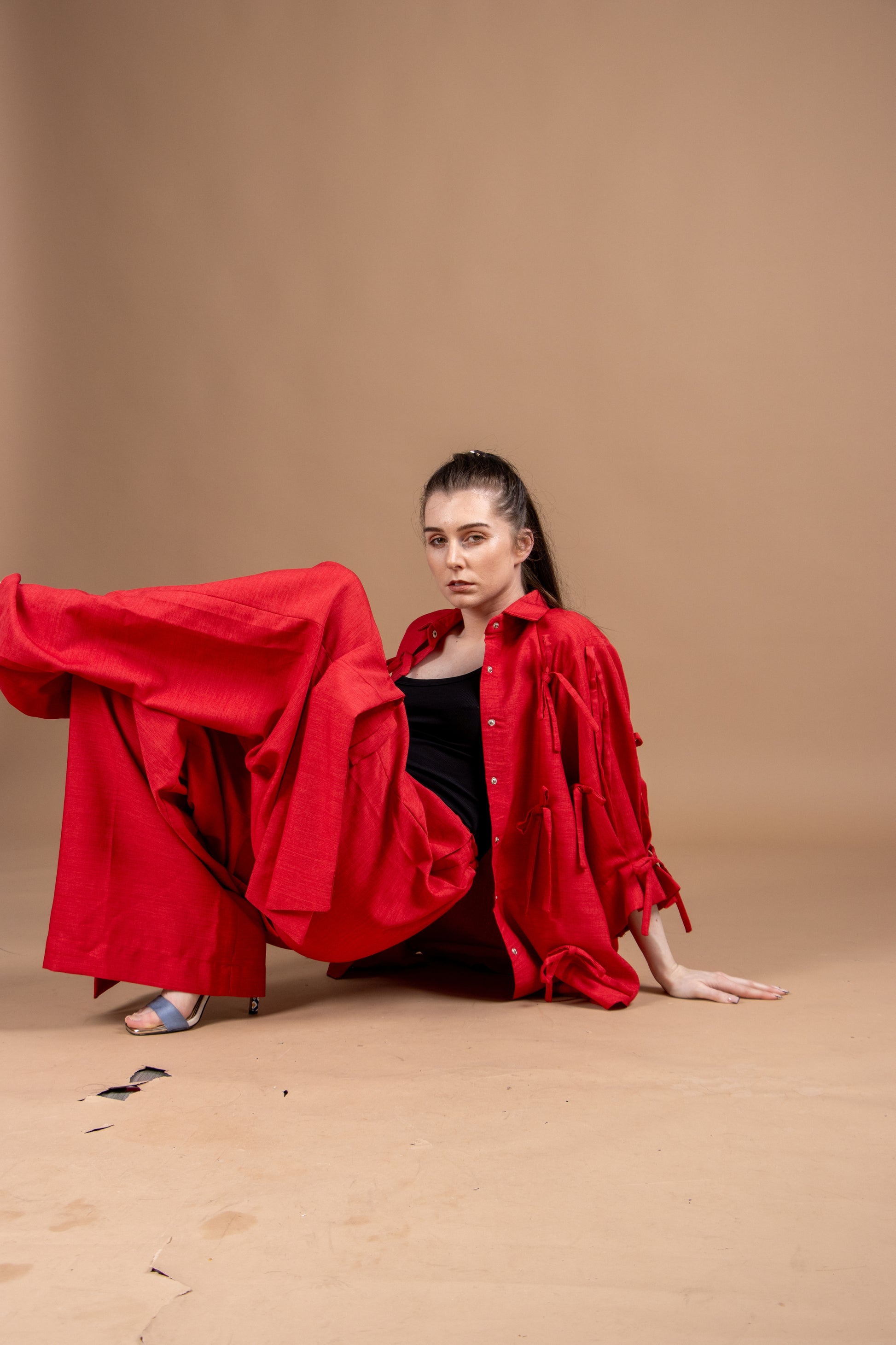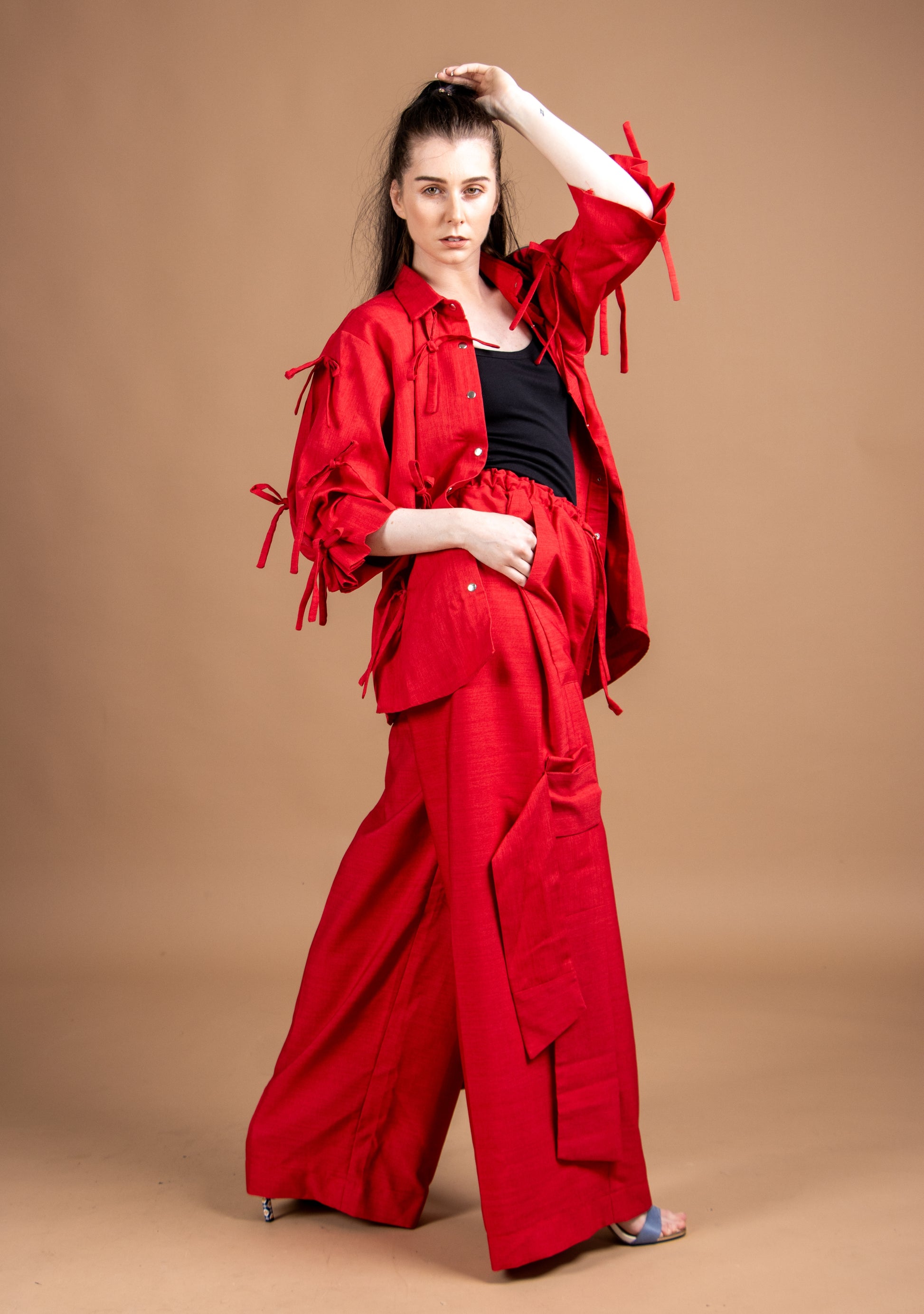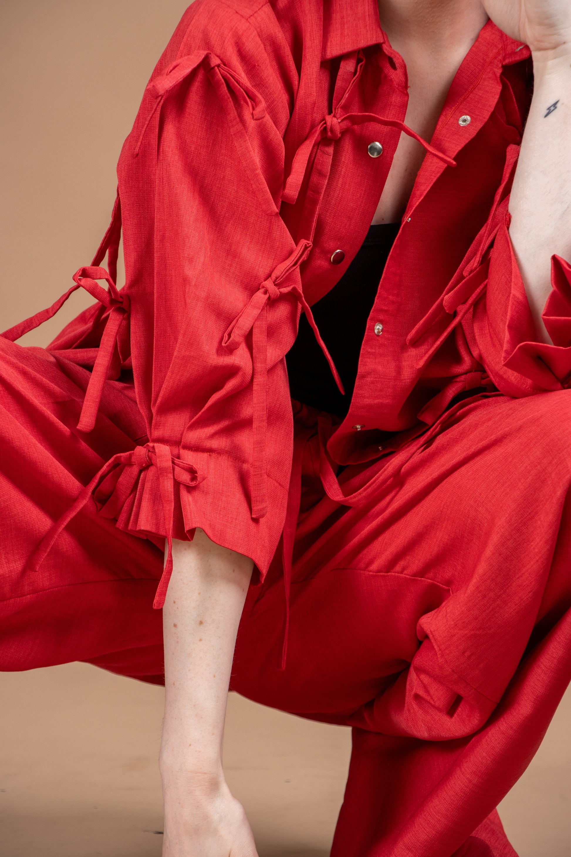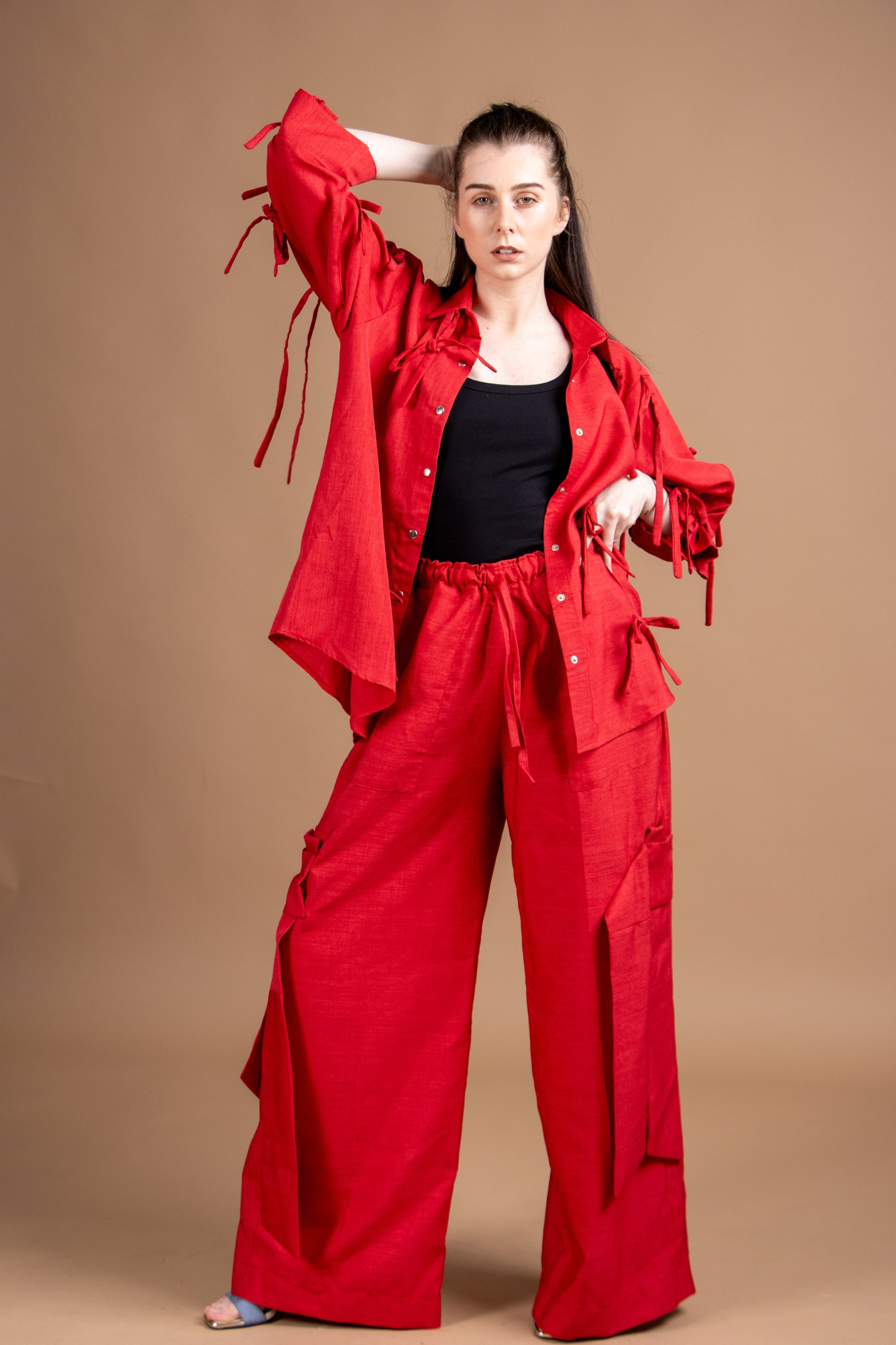 Description: Red linen Long sleeve shirt and Trousers with rope design