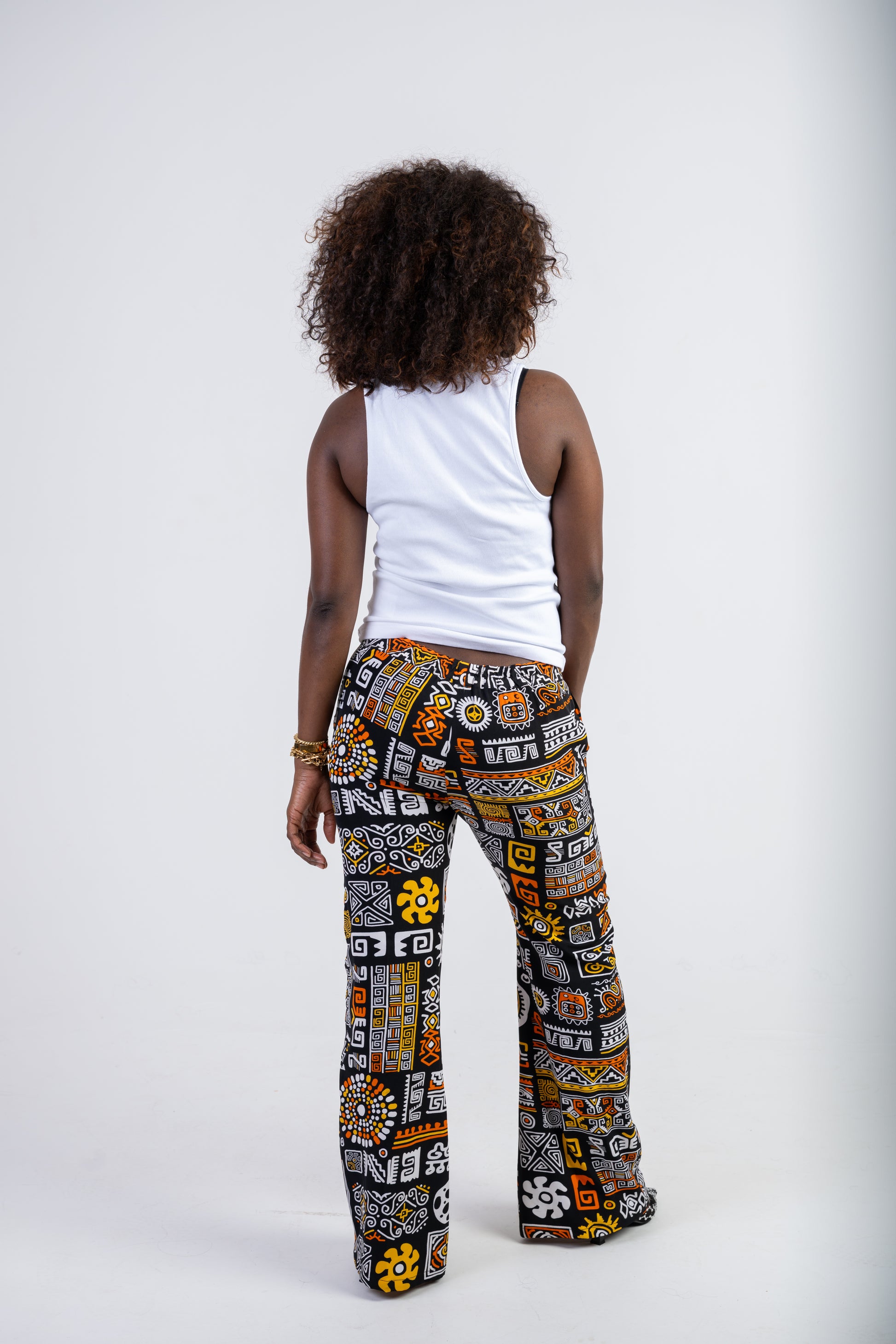 Elevate your style with these bold and vibrant African print flare pants. Designed with a flattering high-waist fit and a comfortable cut, these trousers feature a stunning mix of geometric and floral-inspired motifs in black, gold, and white. Perfect for making a statement, whether you’re styling them for casual outings, cultural events, or dressing them up for a night out.